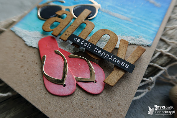 Po raz kolejny zainspirowana tematem wyzwania na blogu Zielonych Kotów, przygotowałam dla Was inspirację wakacyjną. Jedziemy na wycieczkę - to temat najnowszego wyzwania, a gdzie? Oczywiście nad morze! Dlatego też na kartce nie zabrakło klasycznych letnich akcesoriów, czyli modnych okularów przeciwsłonecznych oraz japonek. Wszystkie elementy pokolorowałam tuszami Distress, a dodatki złote wycięłam z papieru lustrzanego. Całość kompozycji jak zawsze zamknęłam stosownym napisem.