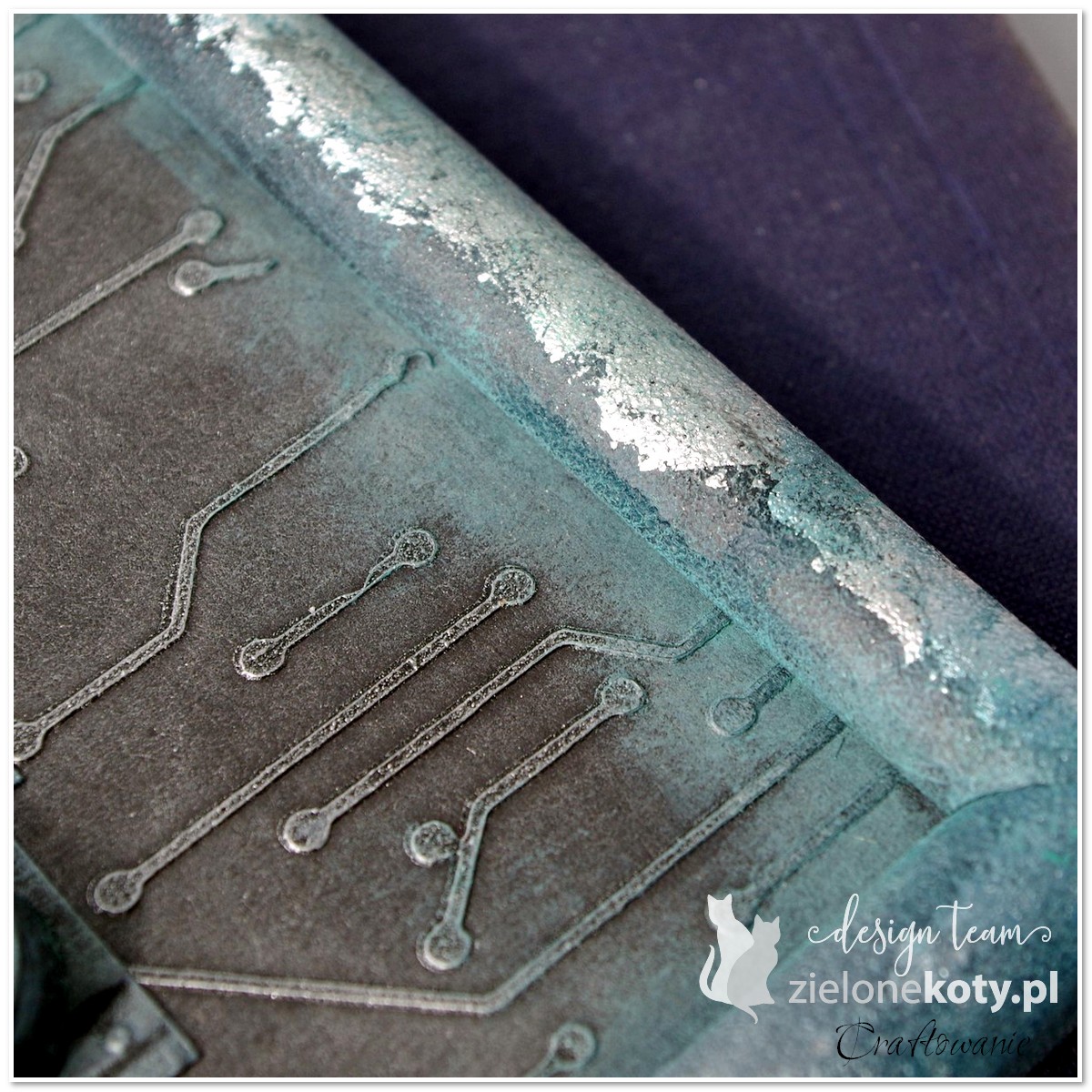 Najwięcej czasu poświęciłam na zrobienie ramki. Pierwsza warstwa to primer (podkład), żeby kolejno nakładane farby dobrze się trzymały. Dalej ramkę pomalowałam czarnym gesso, poprzyklejałam dość niedbale płatki srebrnej folii i zaczęłam dodawać niebieskie zacieki. Na końcu podokładałam matowych wosków, żeby ramka - jak na starą przystało - za bardzo się nie błyszczała. Tło całej kompozycji, to czarny papier, na który nałożyłam przez maskę Tima Holtza czarne gesso. Jak wzór dobrze wysechł, pociągnęłam całość srebrnym woskiem. Dzięki temu zabiegowi sprawia wrażenie podniszczonej, metalowej płytki. Centralną ozdobą jest metalowe serce, które wypełniłam pastą żelową Primy. Zawiera mnóstwo błyszczących drobinek i po wyschnięciu fantastycznie się błyszczy. Całość dopełnia tekturkowy napis od Craft o'Clock.